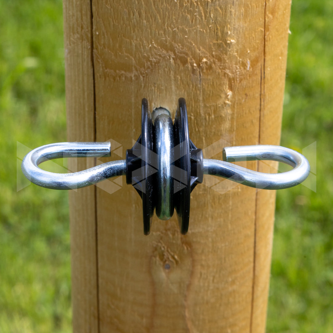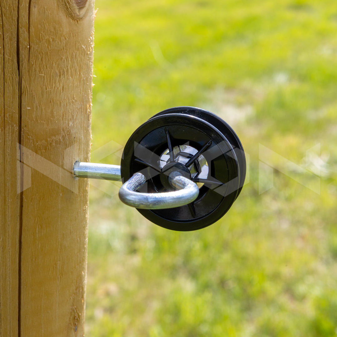 Izolatorul dublu NEXON este conceput pentru instalarea mânerelor porților cu cârlig și/sau buclă pe stâlpi din lemn, oferind o soluție fiabilă și eficientă.