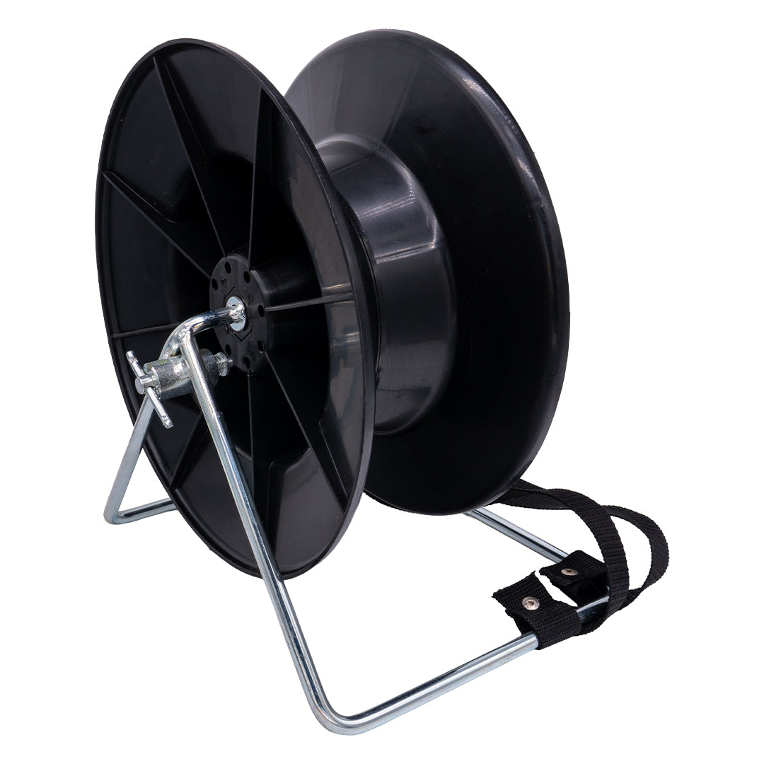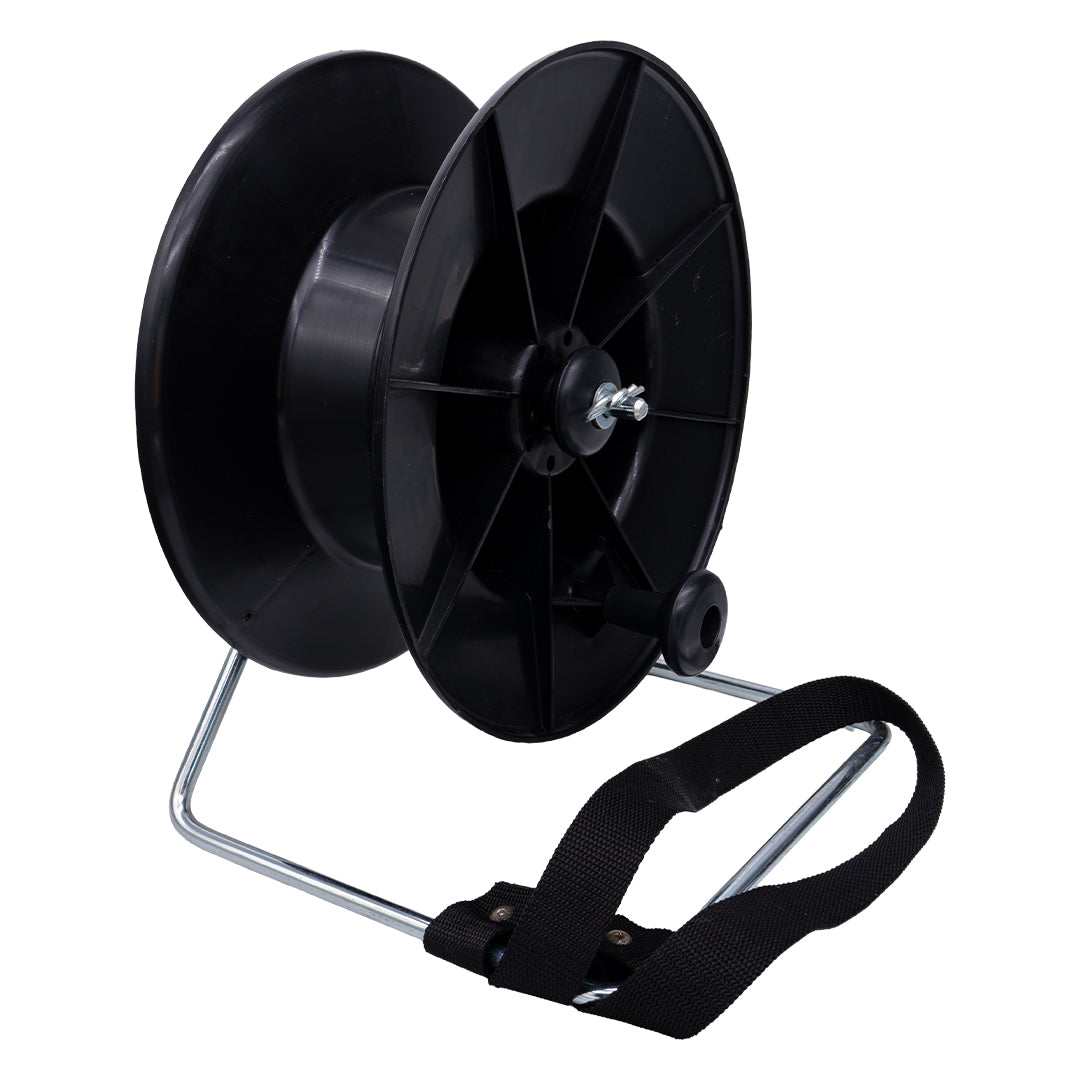 Tambur rezistent din plastic, cu cadru metalic și centură, conceput pentru derularea firului sau benzii de gard electric. Oferă o utilizare confortabilă și o durată lungă de viață.