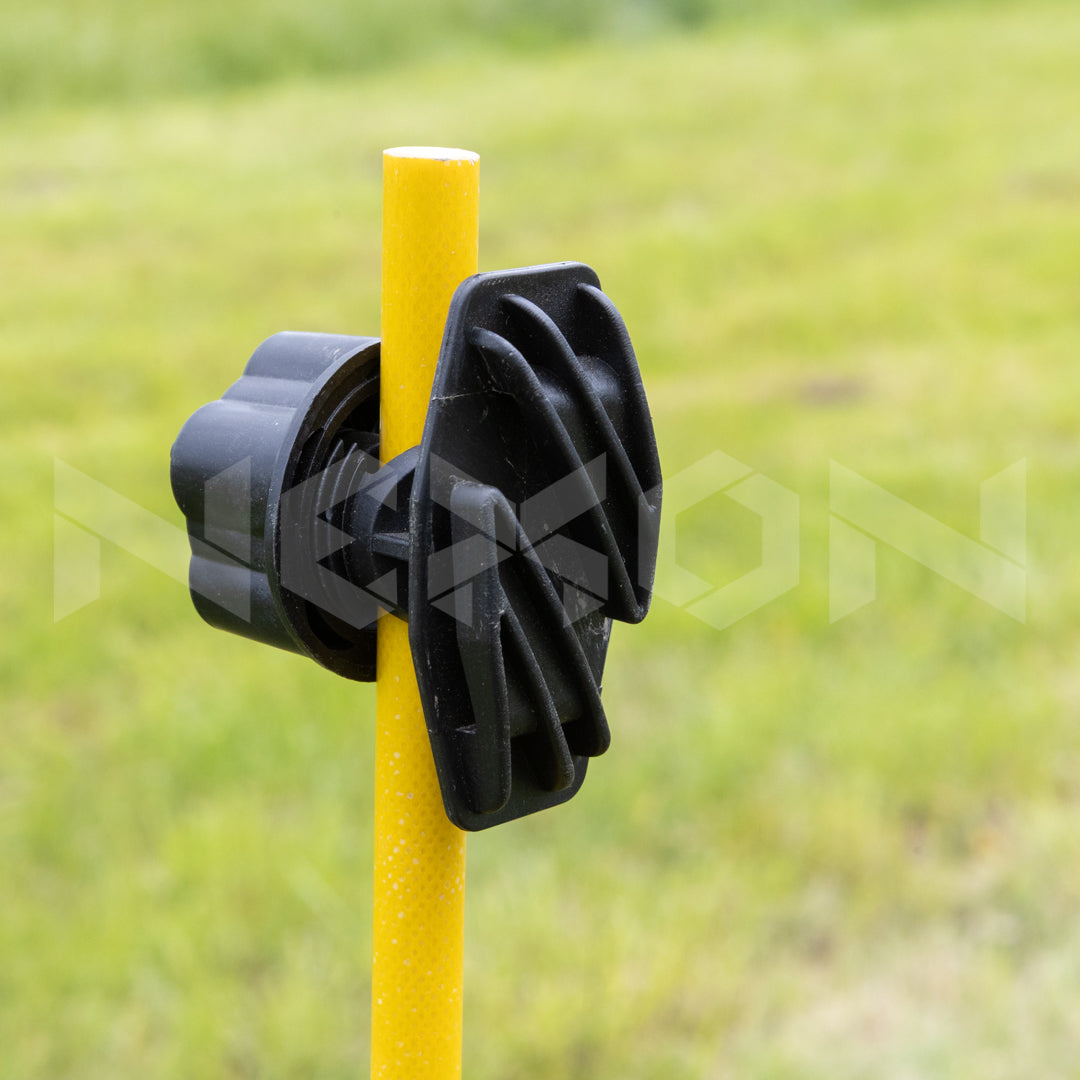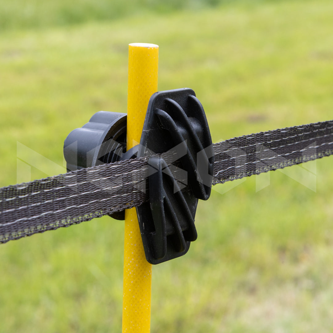 Izolator special conceput pentru bandă, dotat cu un sistem de prindere rapidă pe stâlpi metalici cu diametru între 6-17 mm. De asemenea, este compatibil cu stâlpi rotunzi din fibră de sticlă NEXON pentru gard electric (SKU: STP11). Acest izolator permite blocarea benzii în poziție pentru a preveni căderea sau scurgerile de curent, asigurând o funcționare eficientă și sigură a gardului electric.